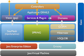 Стоить отметить, что Grails - детище Spring Source, и в его основе лежат некоторые компоненты этой компании, которые разработаны на Java (центральный компонент на картинке, это Spring). Вообще говоря весь код, написанный на Groove транслируется в Java и запускается в рамках виртуальной машины(Java Virtual Machine), в качестве провайдера персистентности и БД умолчанию используется используется связка Hibernate + HSQLDB.